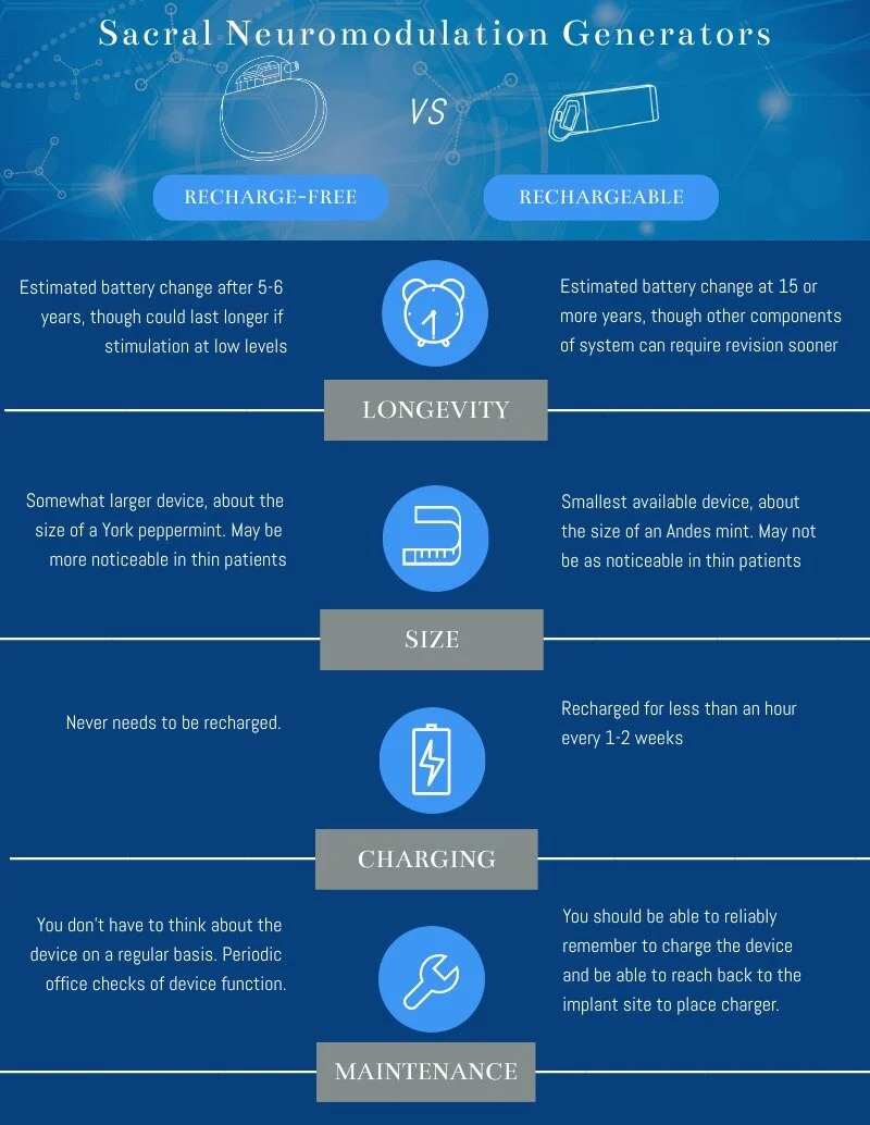 Regardless of how you view long-term therapy, it is clear that rechargeable devices will always require more patient commitment to the device due to the need for regular charging. The time burdens for charging are not excessive with the latest device able to be charged weekly in about 20 minutes or reaching a full charge that can last two weeks in less than an hour. This regular interaction with the device could have varying effects on each individual. I could imagine some patients who would find reassurance and comfort from regularly charging their device. It may give them a sense of control and empowerment to be an active participant in their therapy. It could even be a regular reminder to stick with the behavioral therapies that can make sacral neuromodulation even more effective.